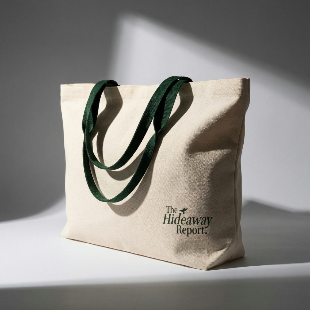 Inspired by the notebooks, maps and quiet discoveries that shaped The Hideaway Report, the Editor’s Carryall is designed for life on assignment — or simply on the road. The structured canvas tote features a green zip-top closure, reinforced green handles and ample interior space for weekend essentials, travel documents or a well-worn guidebook.