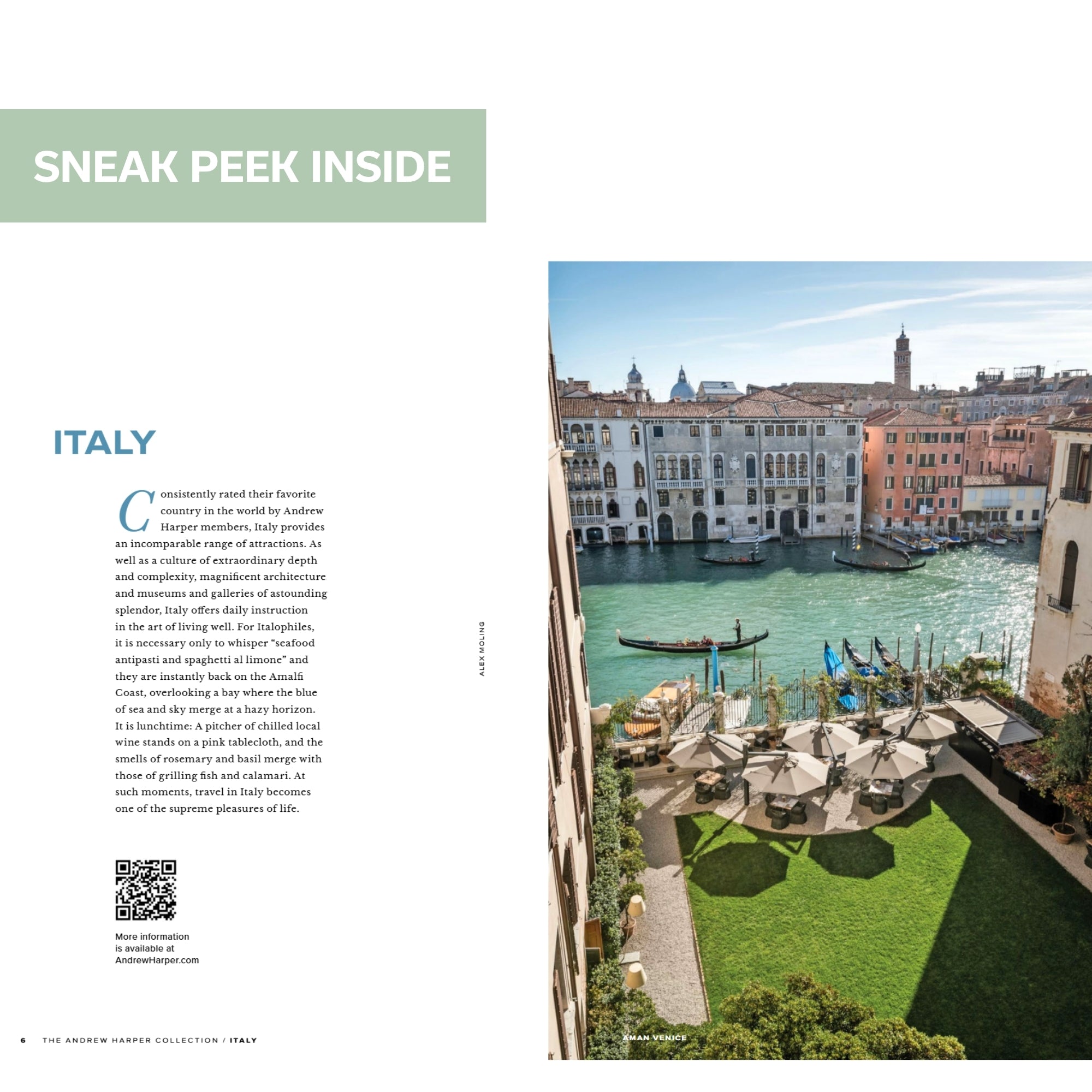Italy is consistently rated as the favorite country in the world by Andrew Harper members. It offers a wide range of attractions, a culture of extraordinary depth and complexity, magnificent architecture, and astounding museums and galleries. Italy also provides a daily lesson in the art of living well. For lovers of Italy, just the mention of "seafood antipasti and spaghetti al limone" instantly transports them back to the Amalfi Coast, overlooking a bay where the blue of the sea and sky meet at the horizon. Moments like these make traveling in Italy one of life's greatest pleasures.